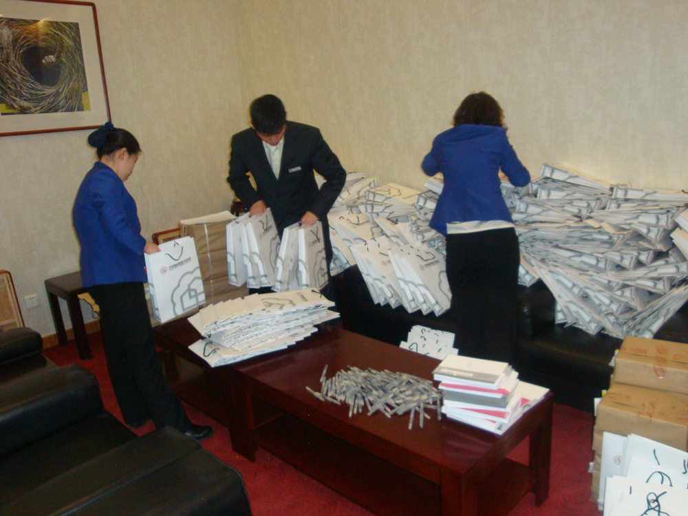 会议进行前,客户服务部人员提前把报告厅200多块座椅背板进行了重新安装,并在会议开始前一周对于4天会议的就餐问题与无线局餐厅和中央电视台后勤服务部门进行了有效沟通,保证了学员就餐。因本次北京市物协同时开办6个项目负责人培训班,报名参加培训的人员多,客服办公室人员放弃了午休和周末,提前协助物协的教师做了大量工作:把学习资料、用书、考试须知共计640套装袋,并进行了4天会议每天上下午的签到、午餐盒饭的发放和就餐秩序的维持工作。客服办公室通过热情优质的服务,获得了物协领导的认可。